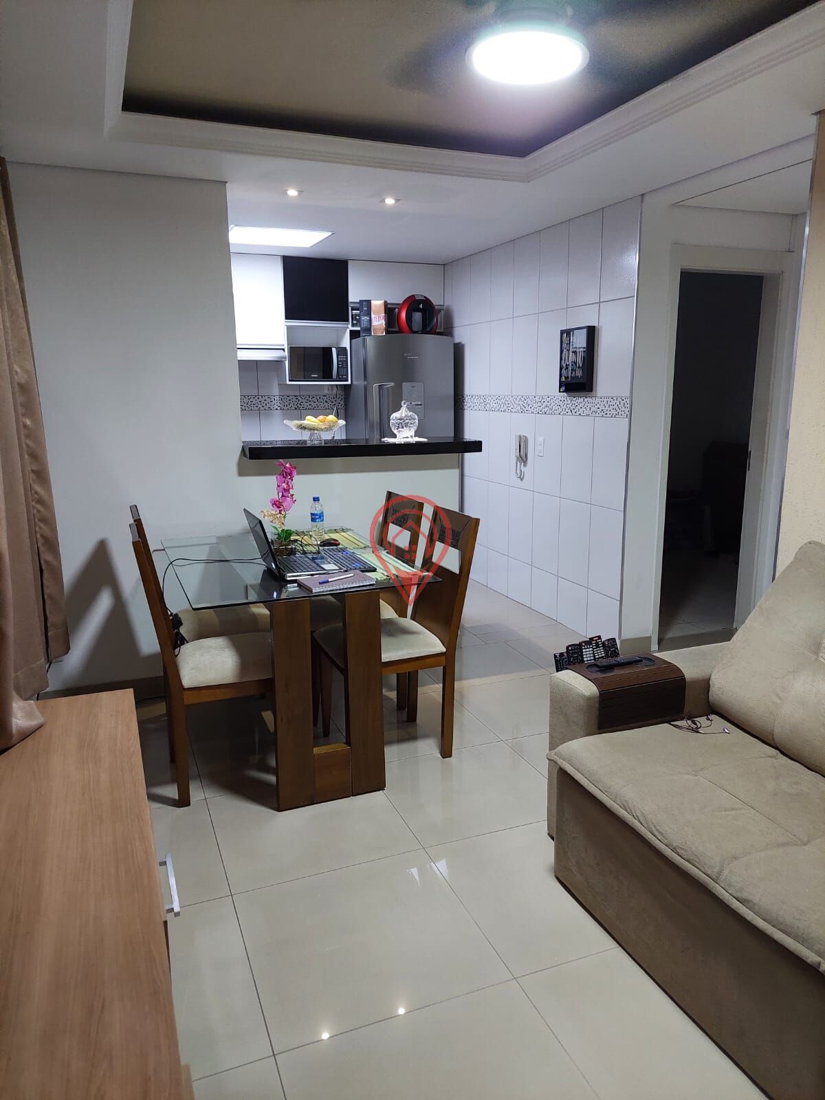 Sala com acabamento em porcelanato e gesso no teto